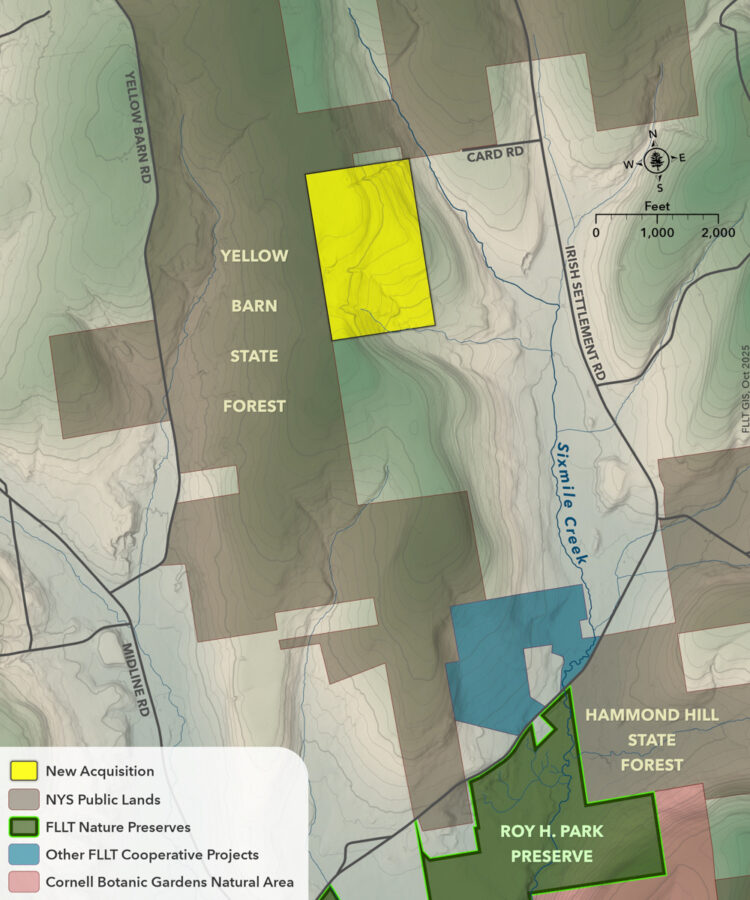 The Finger Lakes Land Trust (FLLT) has purchased 108 acres in the town of Dryden, Tompkins County. The mostly wooded property borders Yellow Barn State Forest and is in close proximity to Hammond Hill State Forest and the FLLT’s Roy H. Park Preserve. With the protection of this parcel, the organization has reached a major milestone of 35,000 acres conserved across the Finger Lakes region.